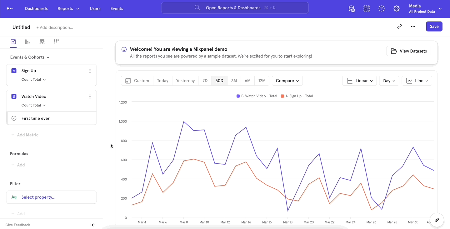 Insights: All event types and properties are available in Insights to break down and filter data.